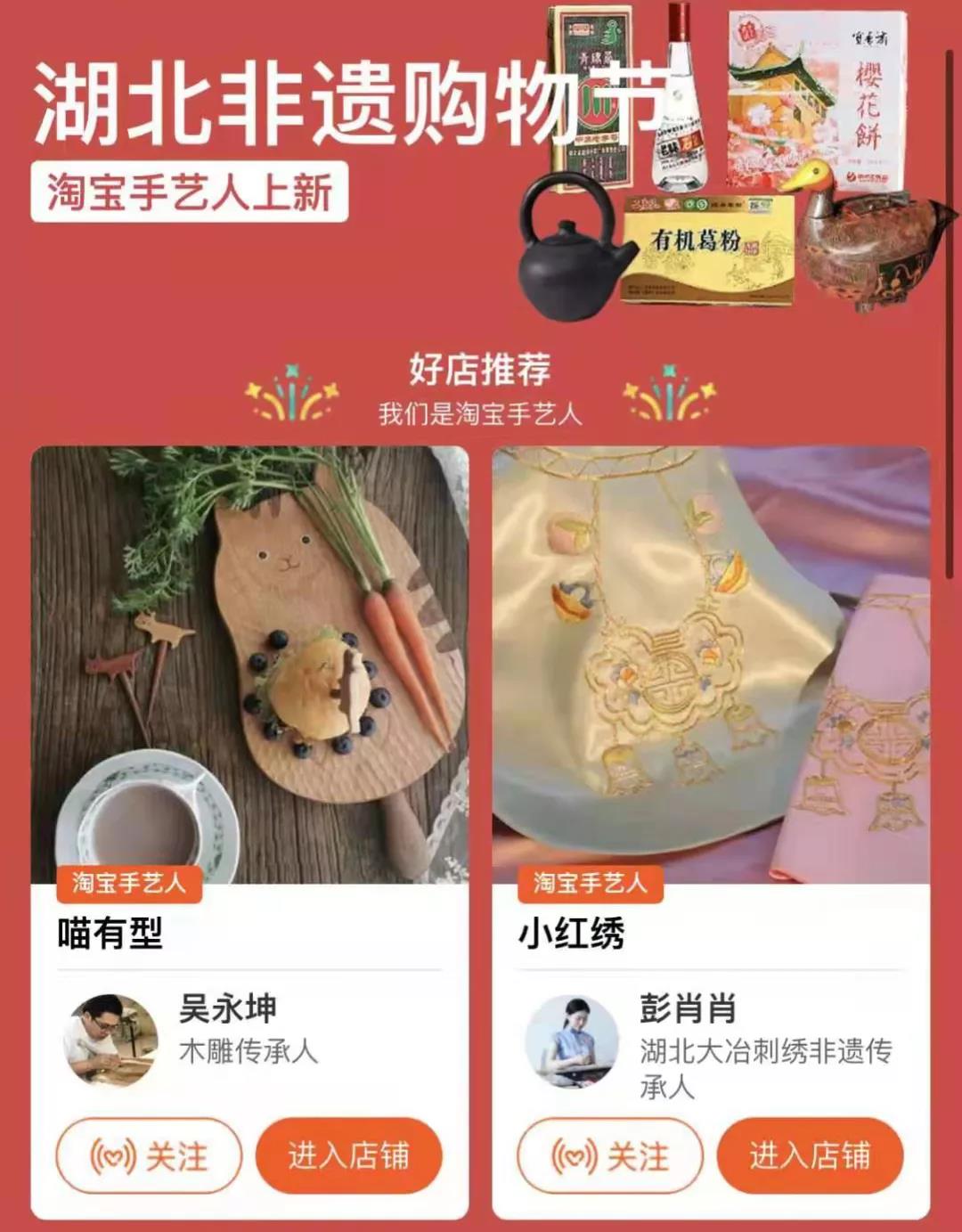 阿里巴巴旗下淘宝手艺人业务对本次湖北非遗购物节活动提供线上电商平台特别支持,推出“湖北非遗购物节”专场,用于集中展现由湖北非遗保护中心推荐的非遗店铺。在6月10日至6月25日期间,打开手机淘宝搜索“湖北非遗购物节”,即可看到上述淘宝手艺人-“湖北非遗购物节”专场。