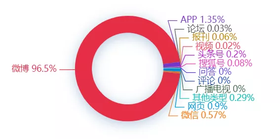 “云游非遗·影像展”活动传播平台分布中,微博平台是信息传播的主要渠道,占比高达96.5%,由@非遗影像展参与发起的新浪微博话题#非遗影像展#传播热度走高,上榜热搜,话题阅读量突破8000万,引起微博网友的广泛关注与讨论;APP平台、网页平台依次位列前三,占比分别达到1.35%、0.9%,微信、视频、报刊等其他平台信息占比较少。