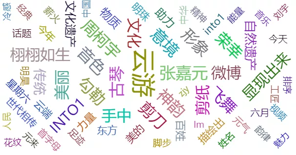 对“云游非遗·影像展”活动进行热词传播分析,云游(95598次)、张嘉元(45701次)、古琴(45636次)、音色(44141次)、神韵(44107次)位列前五位,相关活动涉及中国传统曲艺、饮食、手工技艺等非遗领域的方方面面。其中以京剧、昆曲、古琴、笛等为代表的中国传统文化吸引网友围观讨论,成为话题热门;地方特色美食、地方民俗、传承故事等也备受关注。此外,周柯宇、张嘉元、刘宇、黄明昊等人气明星纷纷发文宣推,带动活动热度走高。