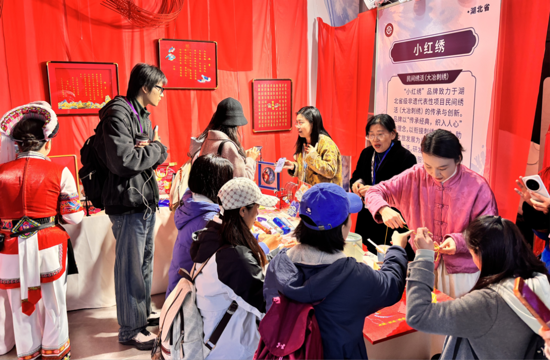 楚式漆器髹饰技艺现场展示了50余件精选作品以及全新开发的“荆作·楚生活”系列文创作品。传承人向游客详细讲解漆器的设计、制胎、髹漆、彩绘,尽显荆楚匠韵。集冶金、声学、力学于一体的青铜编钟制作技艺,不仅展示了经典编钟套件,同时还带来了适配现代生活场景的创新成果“一见钟情”“钟声幸福”“敲有趣”等便携文创产品。大冶刺绣的《千里江山图》主题绣品、精致双面绣台屏、寓意美好的刺绣婚书等一系列匠心之作,以其巧夺天工的针法与浓郁的荆楚韵味吸引了众多游客,传承人为游客免费赠送刺绣挂件,派送零基础DIY刺绣材料包,现场传授刺绣技艺,让游客在飞针走线中沉浸式感受非遗技艺的独特意趣,近百名游客绣出了属于自己的第一幅绣品。