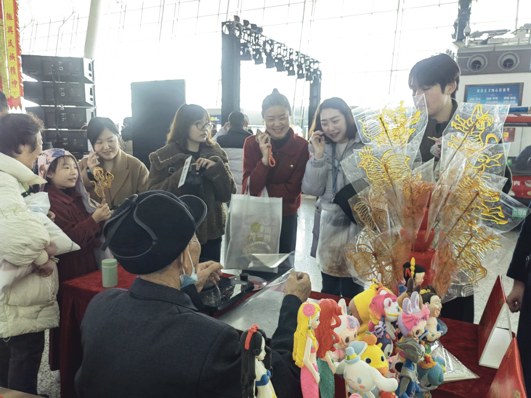 潜江糖画与面塑展位前,旅客们驻足围观、笑语盈盈