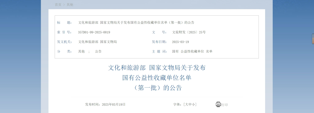 根据《财政部 海关总署 税务总局 文化和旅游部 国家文物局关于国有公益性收藏单位进口藏品免税规定的公告》(2024年第4号)规定,现将享受该项税收优惠政策的国有公益性收藏单位名单(第一批)予以公告。