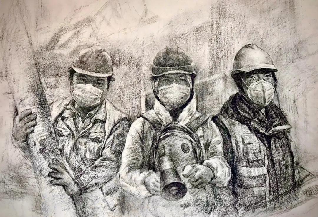 李楠《火神山·热血建设者Ⅰ》55×40cm 纸本素描 2020年