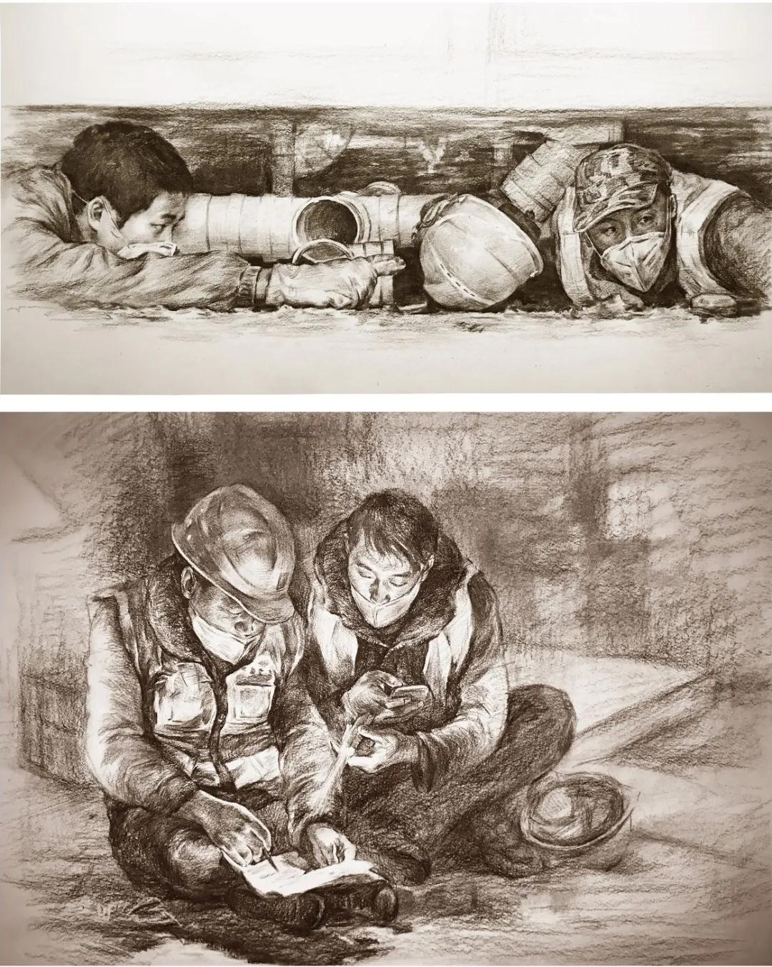 李楠《火神山·热血建设者II、III》组画 80×55cm 纸本素描 2020年