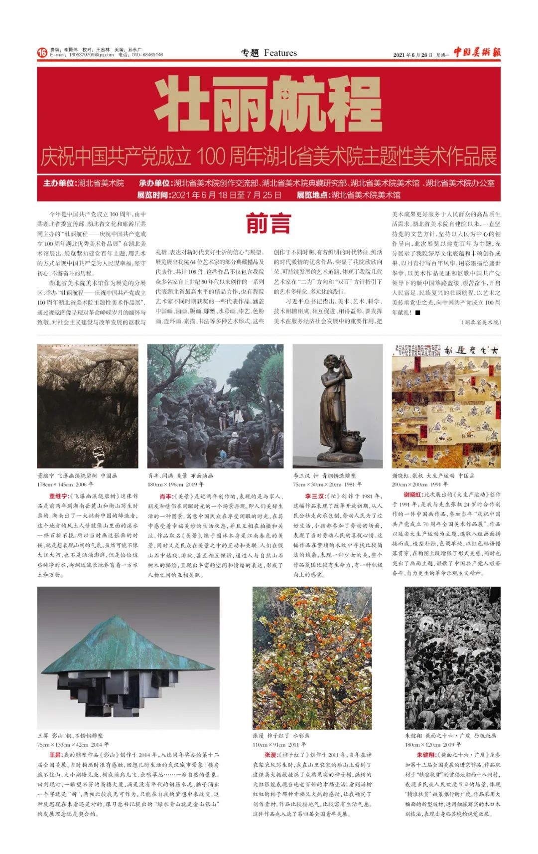 6月,《中国美术报》报道我院“壮丽航程——庆祝中国共产党成立100周年湖北省美术院主题性美术作品展”。