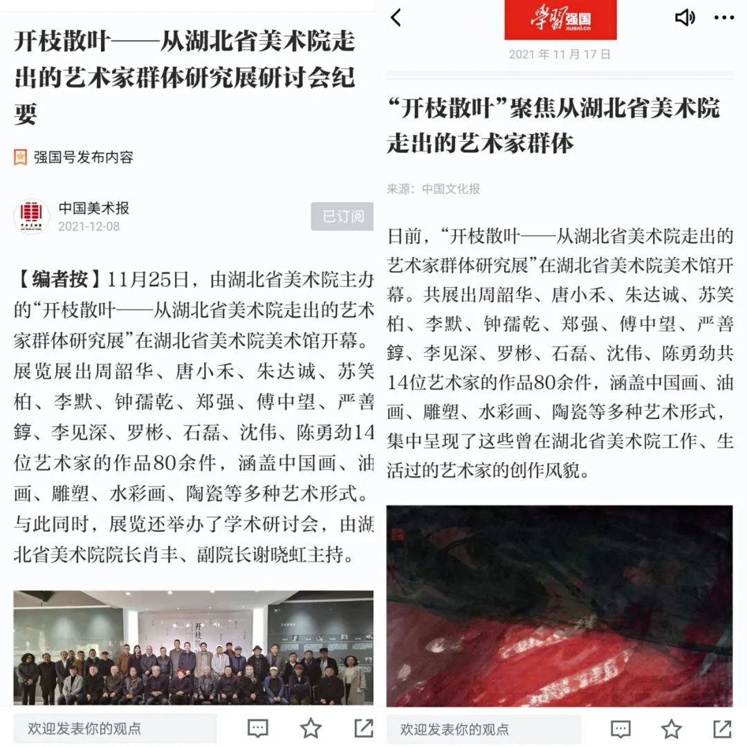 11-12月,学习强国转载《中国美术报》《中国文化报》报道我院“开枝散叶——从湖北省美术院走出的艺术家群体研究展”。