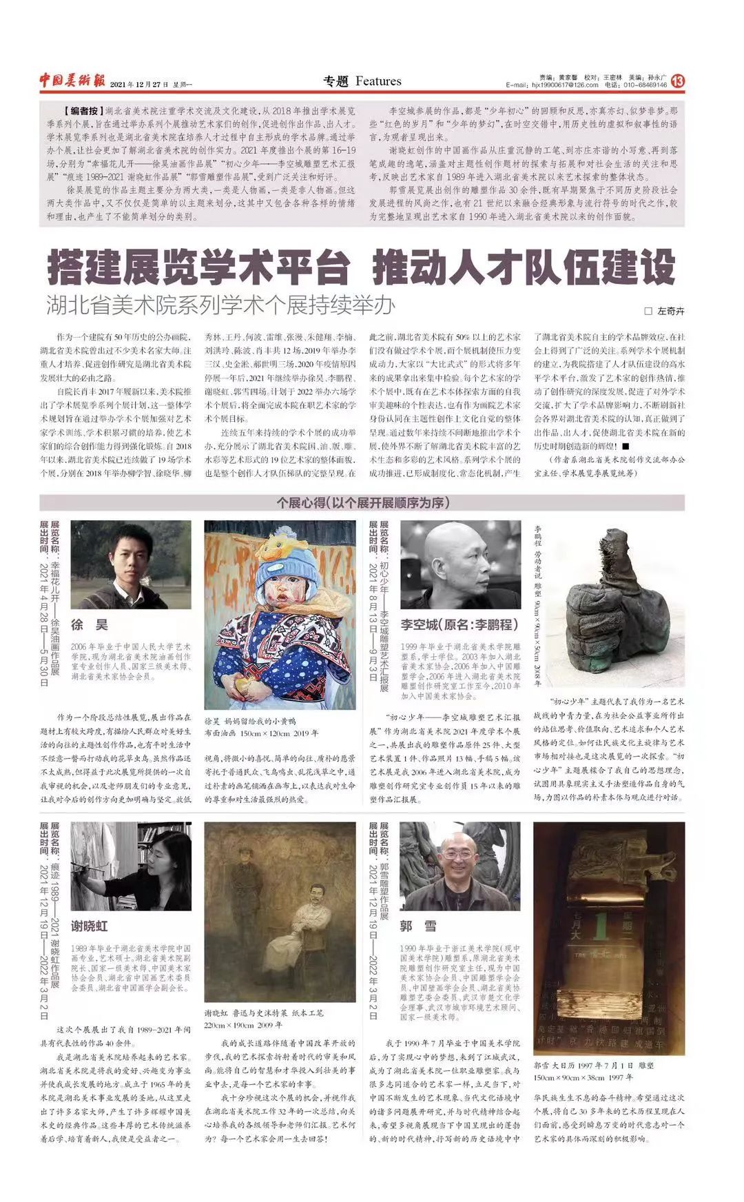 12月,《中国美术报》报道我院2021年学术展览系列个展项目。