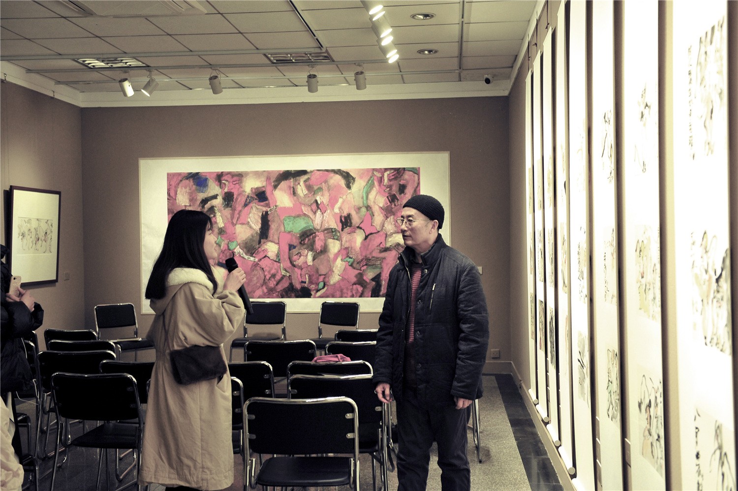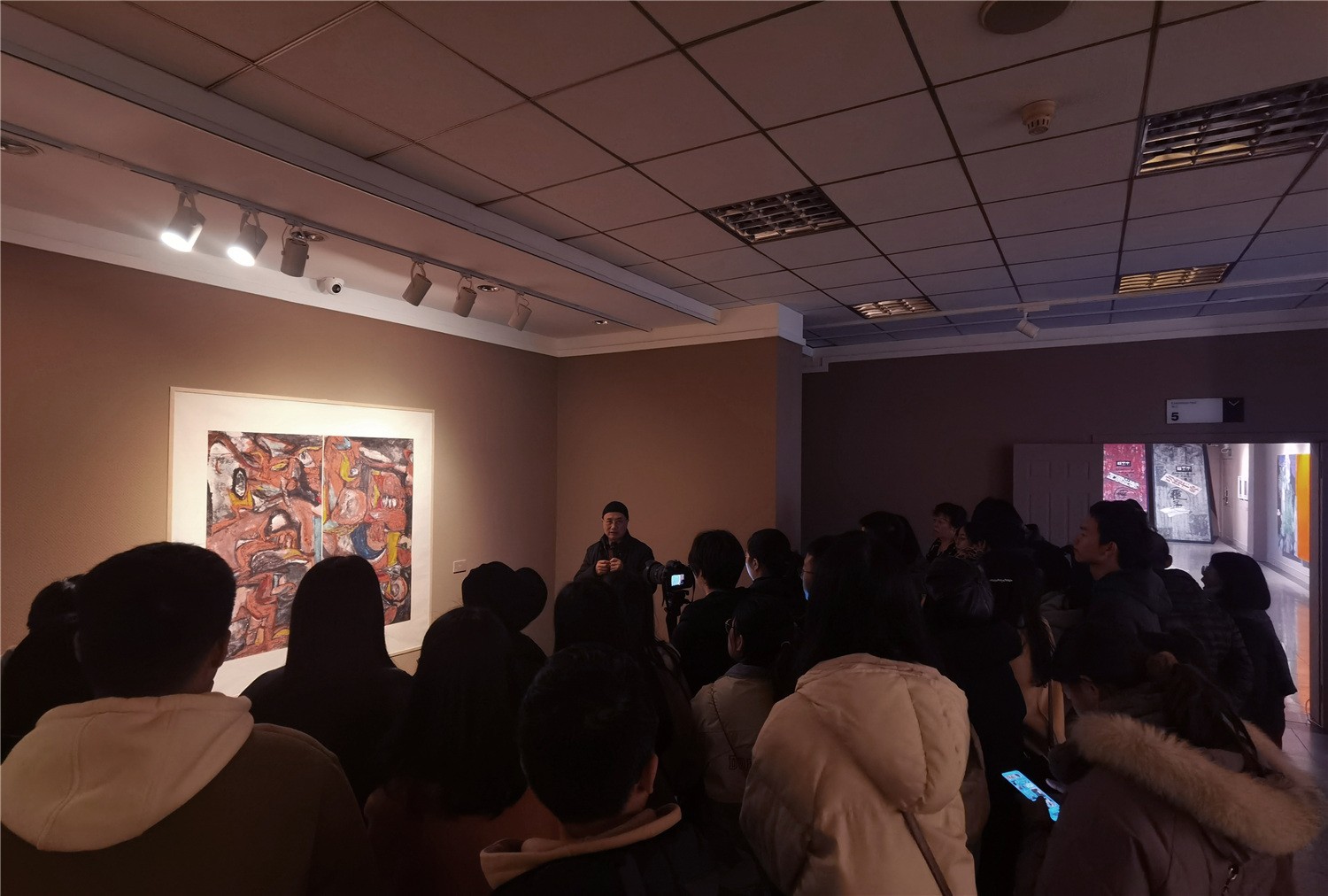 座谈后,钟孺乾对照展厅中的作品,就创作的背景、题材的选择、材料的实验、笔墨造型的考量,向同学们做了详实的讲解。同学们也从观展感受和自己在艺术创作时的体会出发,进一步讨论如何“画出点意思”。