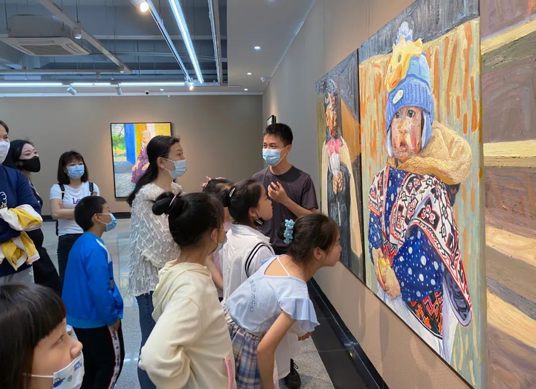 随后,徐昊同参与者们分享了自己的创作心得,他以自身作品中充盈着的浓烈色彩为例,强调美术教育以及艺术创作中个人特质的重要性。随后,徐昊邀请大家走进展厅,从题材选择、到画面构图、再到细节处理,对照画作逐一做出生动的讲解。他特别启发孩子们在绘画时除了关注所表现对象的形状外,还要倾注感情、充分发挥想象力,例如由一朵花可以联想到母亲;他也提示老师们在指导孩子们创作时,真挚、充沛的创作情绪与娴熟的创作技巧同样珍贵。