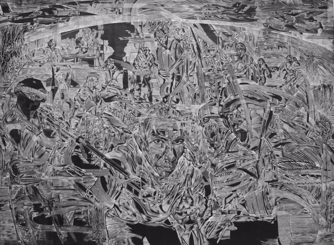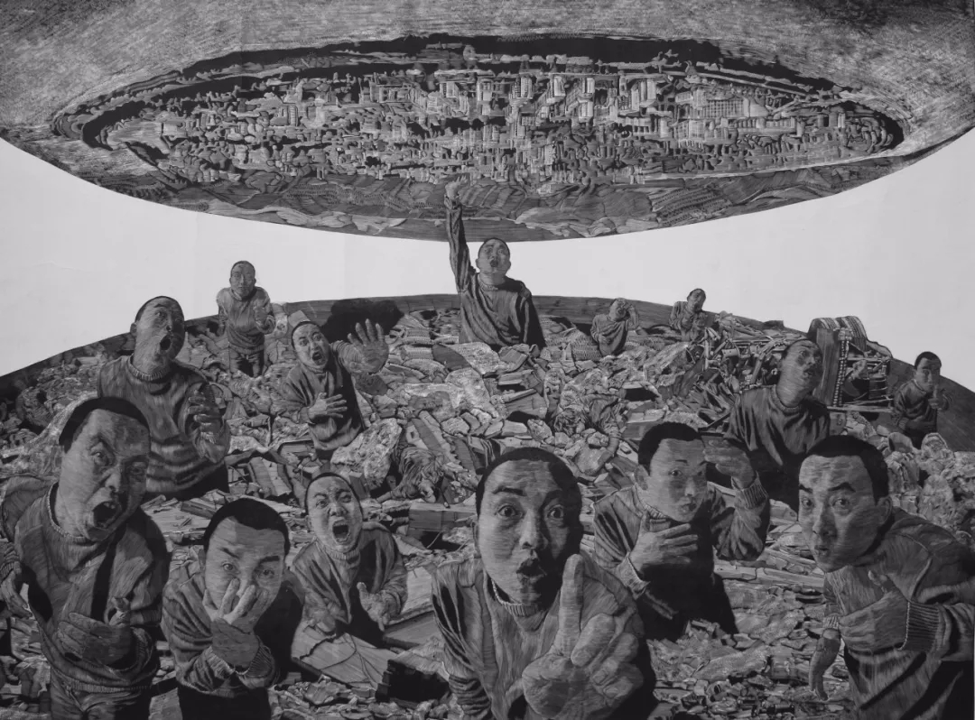 显而易见,版画语言和技术的精纯是朱健翔作品的明显特点,但这并不是对以往黑白木刻创作完整性、典型性样式的重复,而是运用细密化的娴熟刀法,将形象碎片眼花缭乱地编织在一起,直观可触又恍如隔世,呈现出一种纪实与虚构错综复杂的幻象。他所创作的《截面》系列,在近十来年“灰调木刻”潮涌中,不断浮现并引人注目。
