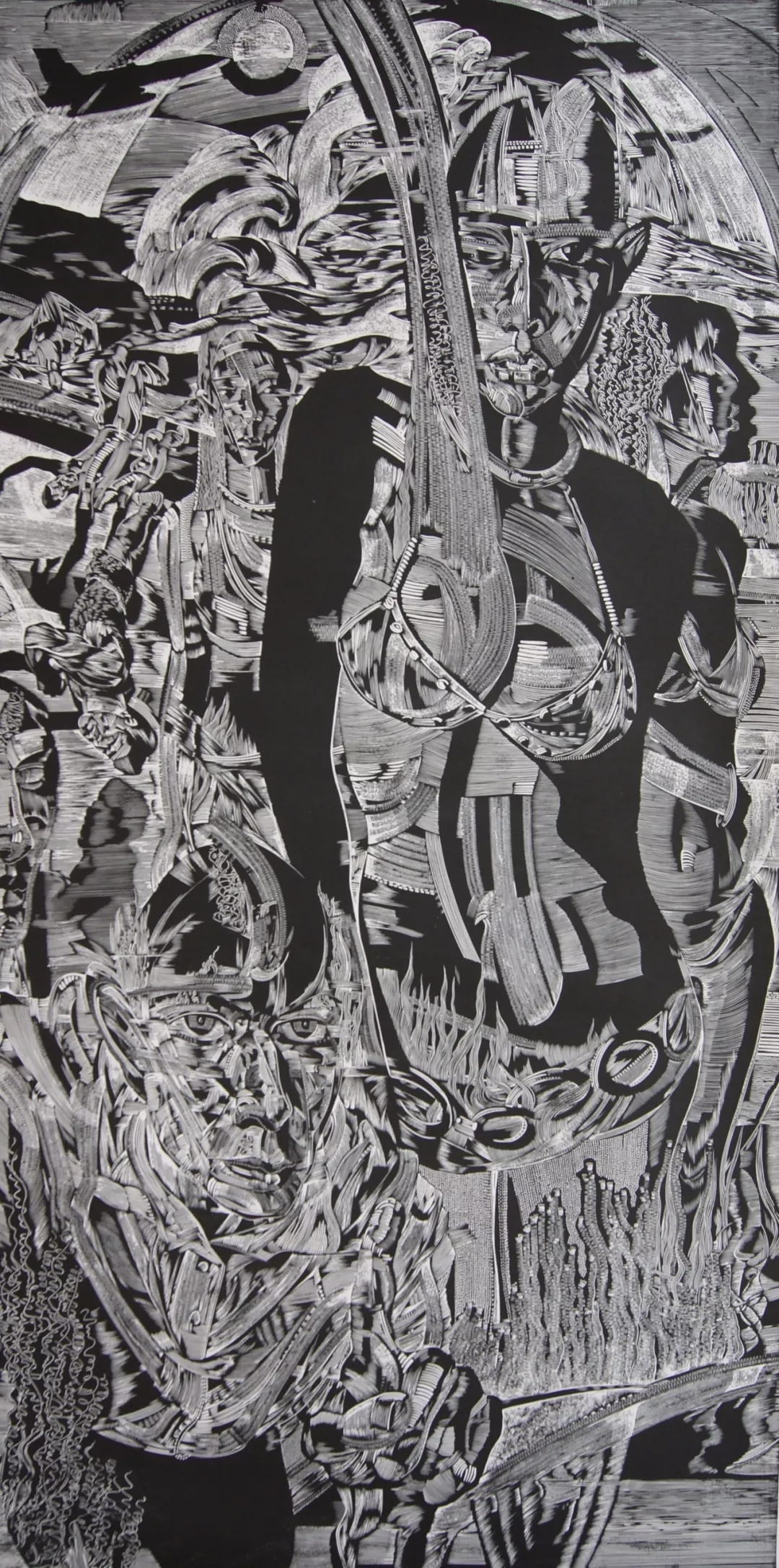 另一方面,木口木刻技术延伸到替代刻制版材,也经历了一个由尽可能呈现既有的面貌到选择性采摘的过程。朱健翔选用大幅面的量产亚克力板作为版材,所采用的凸版刻制技术,初期完全沿用木口木刻技术,甚至一度沉溺于此。之后的刀法变化更多依托形象需要,简化为平行线和平行曲线为主,讲究单纯中的变化,一部分还由铜版画雕凹线的技术变通而来,与凸版的刻制要求巧妙地衔接,这不仅克服了以往刀法效果罗列的弊端,而且与专注于状物而抑制刀法表现的做派划清界线。
