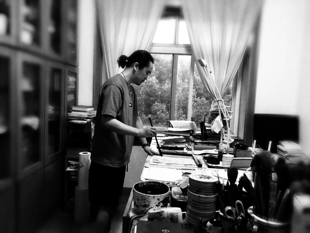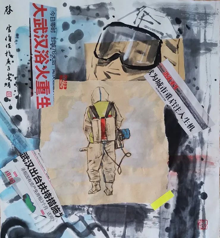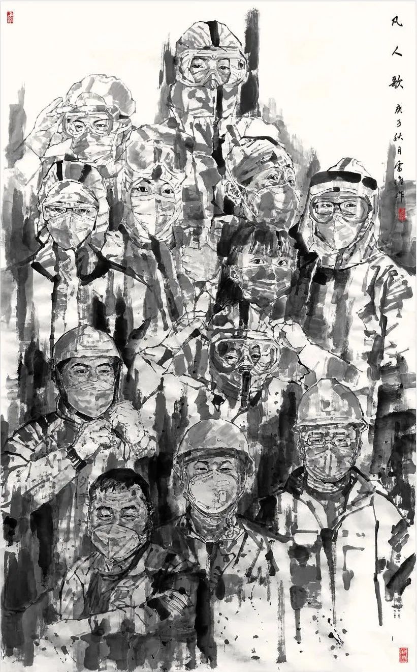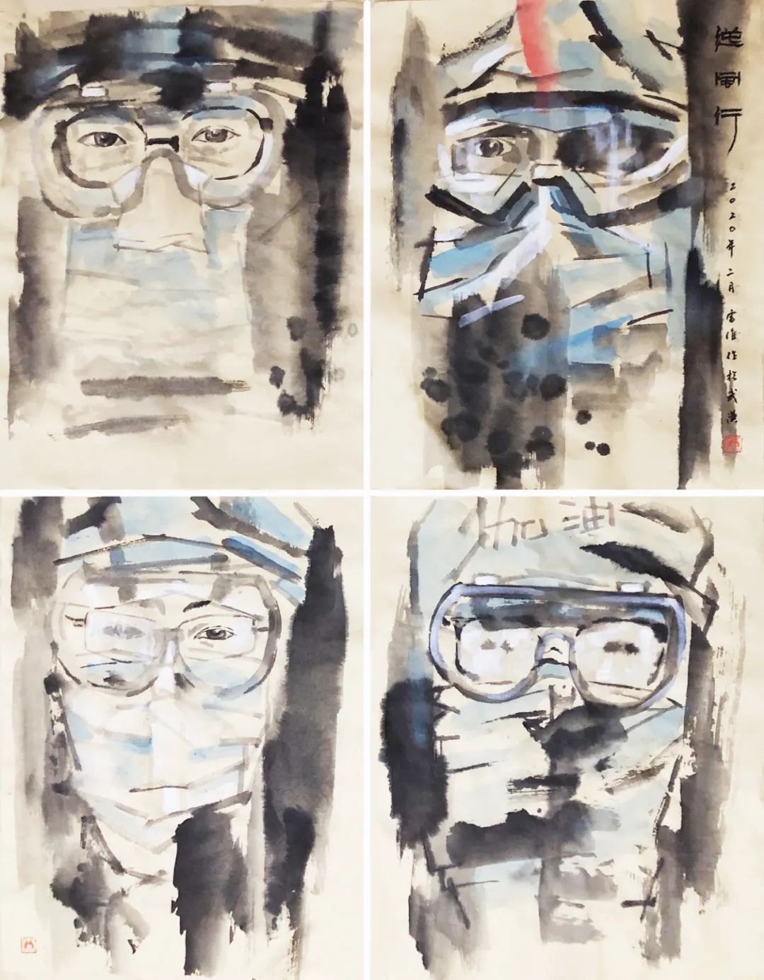 当从电视里见到全国各地医护人员陆续来驰援武汉的消息和画面时,深受感动,一股创作的冲动代替了“怡情趣味”。没有合适的工具和材料,就用习字的毛边纸,以水墨写意的形式,画出了一组医护人员的“肖像”。画面中的人物形象全被防护服和护目镜遮掩着,除了一双勇敢、善良的眼睛,几乎无处表达。反复试验中,水墨的浓淡枯湿竟能有如此强大表现力,使我感觉到传统中国水墨画从内容向形式突破的强大力量。随之创作的《逆风行》、《重启》、《晨星》便是这一时间段中的“意外收获”。