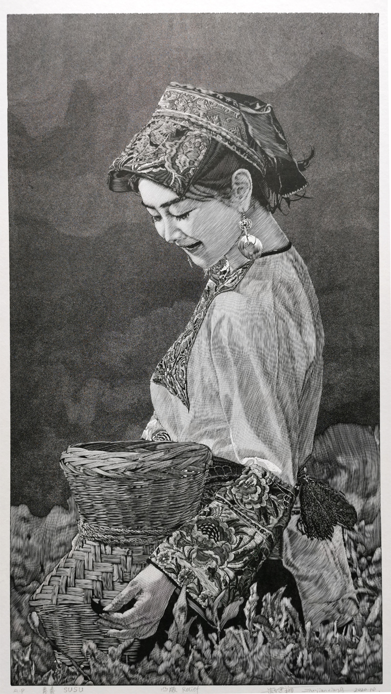 这是一幅描写湘西土家族采茶女的作品,采用具象写实的手法,将西方木口木刻技法与中国工笔画的艺术特点相结合,表达单纯与自然之美。疫情期间,与外界的暂时隔离,也使我更专注于艺术的创作,同时,我也将期盼疫情早日结束,人们能远离病毒,重回自然、和谐、宁静、秩序的愿望融入作品之中。