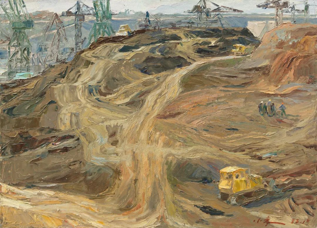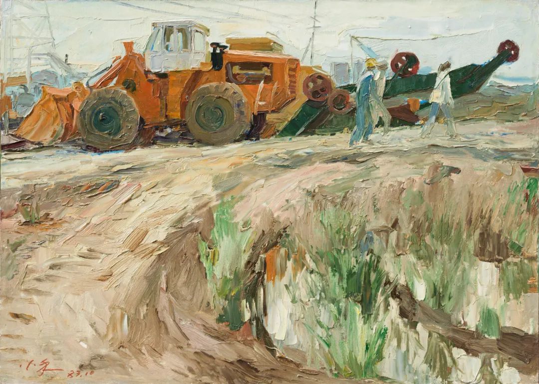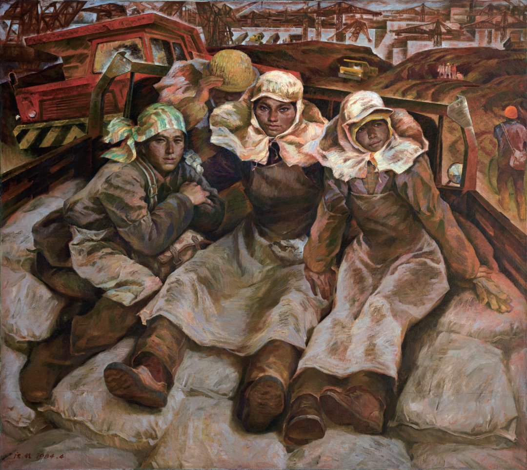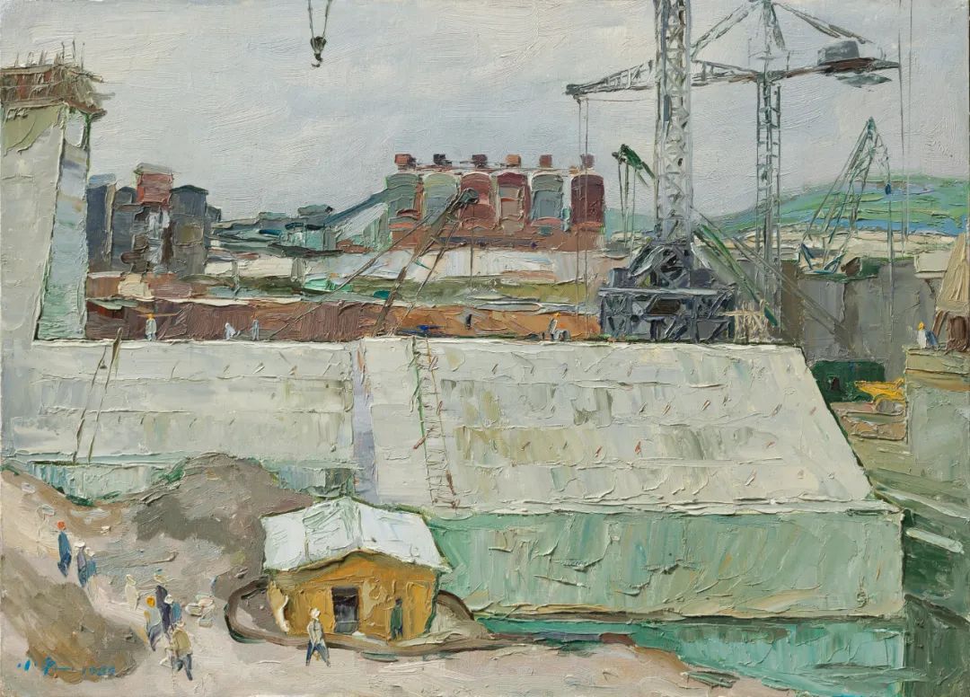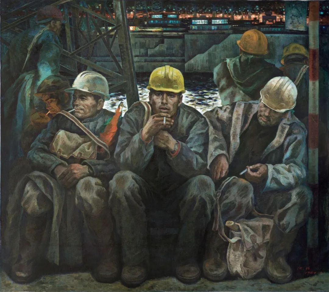 《在大风大浪中前进》中那可贵的真实,在1984年唐小禾与夫人程犁合作的《葛洲坝人》(三联画)中深化为情感的天真、质朴与淳厚。观看、体验、走访、写生,夫妻二人受高峡出平湖之愿景的感召奔赴葛洲坝,在坝上和建设者们同吃同住,一待就是半年。《工地上的母亲》《大坝中坚》《大坝的儿女》……比起“巨兽”般庞大、慑人的机械,“人”与其总和着的一切社会关系更令艺术家动容:父辈们的神情和夜里通明的灯火一样使人安定,儿辈们拥在一起享受午间的休憩,坚忍的母亲们则干着别人都不做的最累的活计。通过三个日常又隽永的坝上景的并置,唐小禾与程犁在描绘出葛洲坝人生命接力的同时,也完成了一个隐喻:葛洲坝人建成了葛洲坝,葛洲坝是人、情、境全部的浇筑。