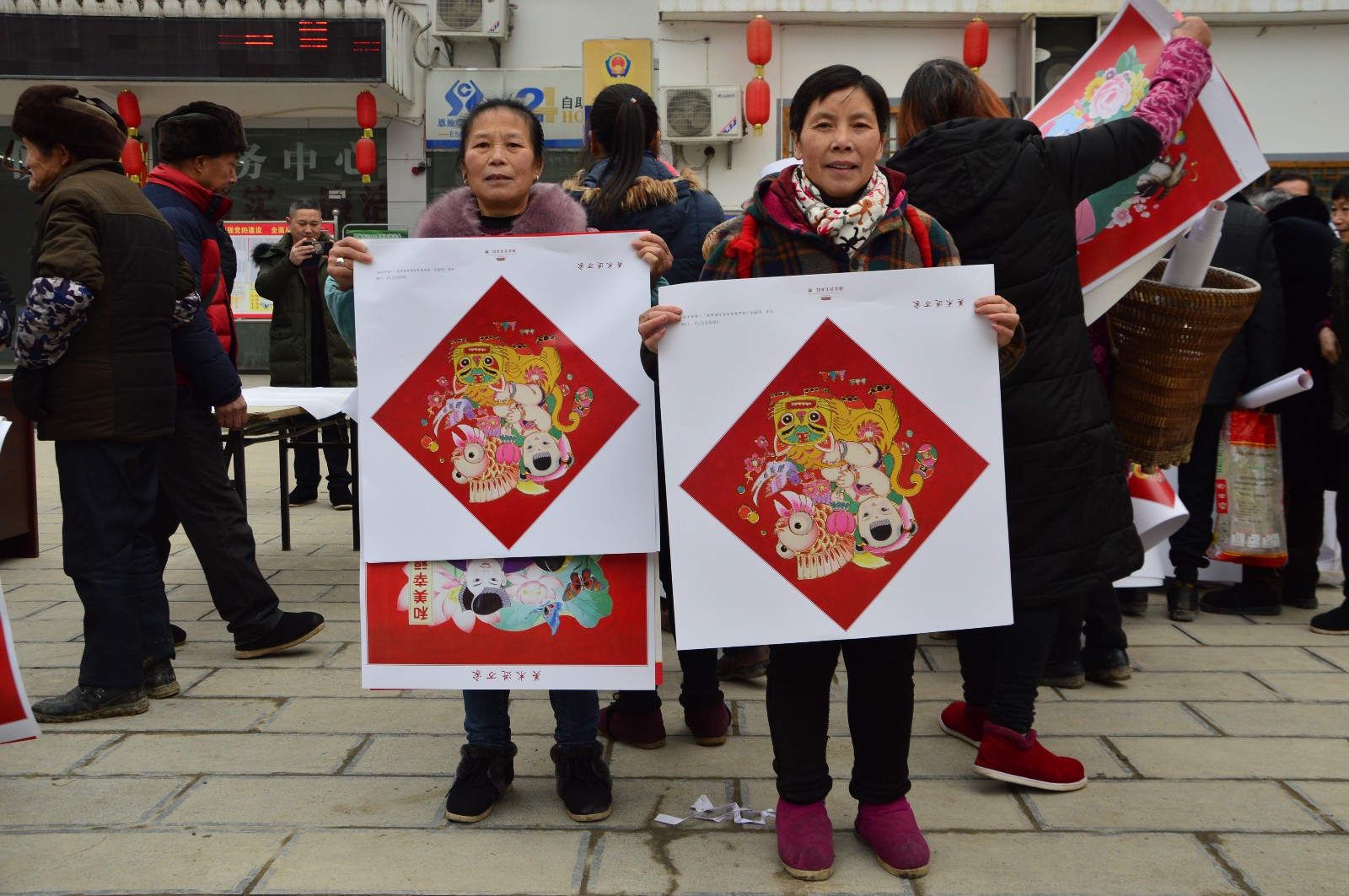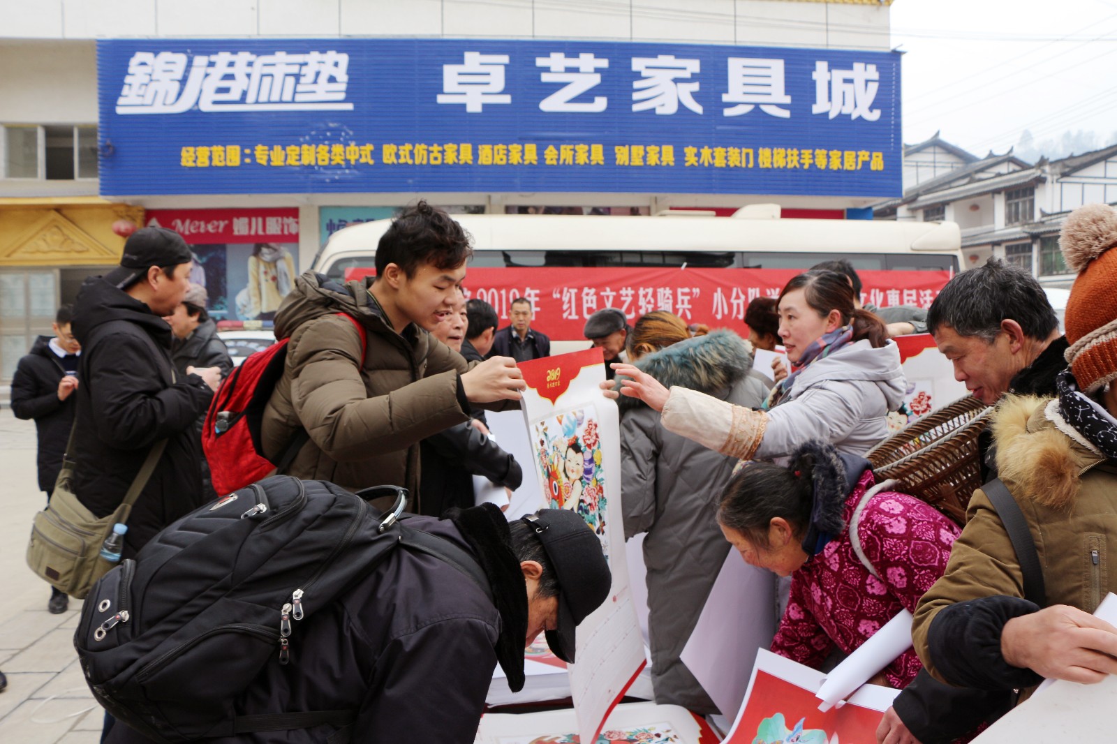 距离春节还有两周时间,龙马村的街头已经洋溢着节日的气氛。近千名村民陆续从四里八乡闻讯赶来,我院文化志愿者们和恩施州美术家协会工作人员连续3小时不间断地向群众发放年画和春联近万份,还向群众讲解年画和春联的含义、张贴方法,并了解他们的具体需求,以便今后更好地开展活动。离开之际,乡亲们依依不舍地说:“年画很好看,很有过年的感觉,明年你们一定要再来呀!”志愿者们纷纷表示:我们一定会再来,希望你们过上一个祥和的春节,生活一年更比一年好!