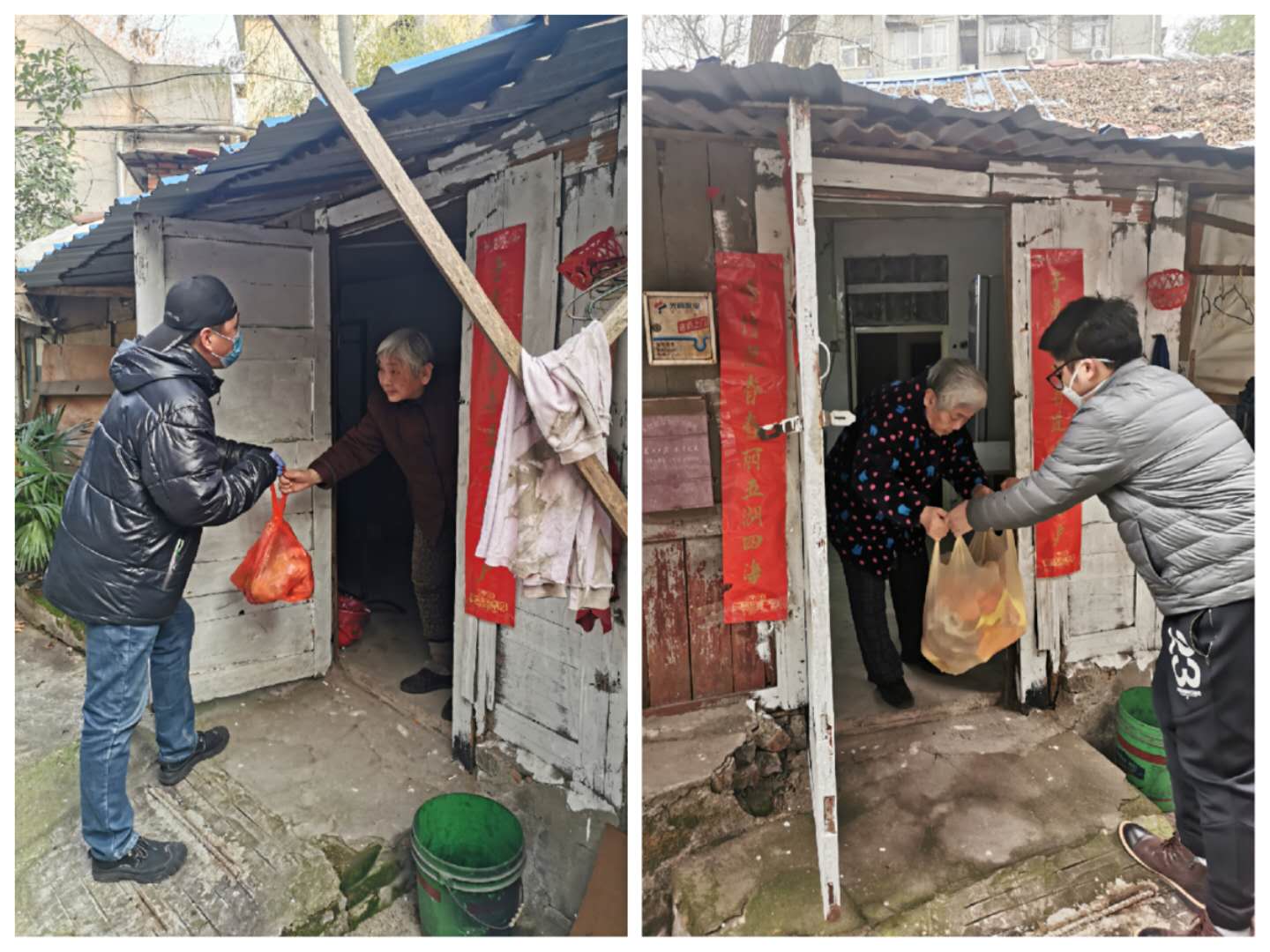 马辉(左)、葛奕明为生活困难的老人送生活物资