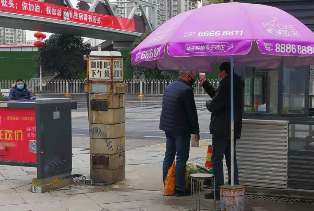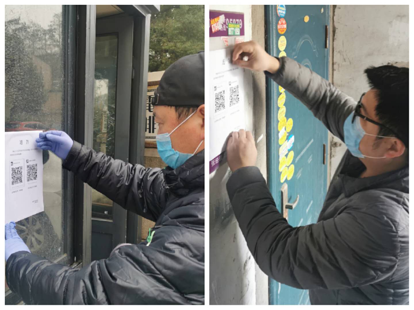马辉(左)、葛奕明在院内张贴社区购菜群二维码