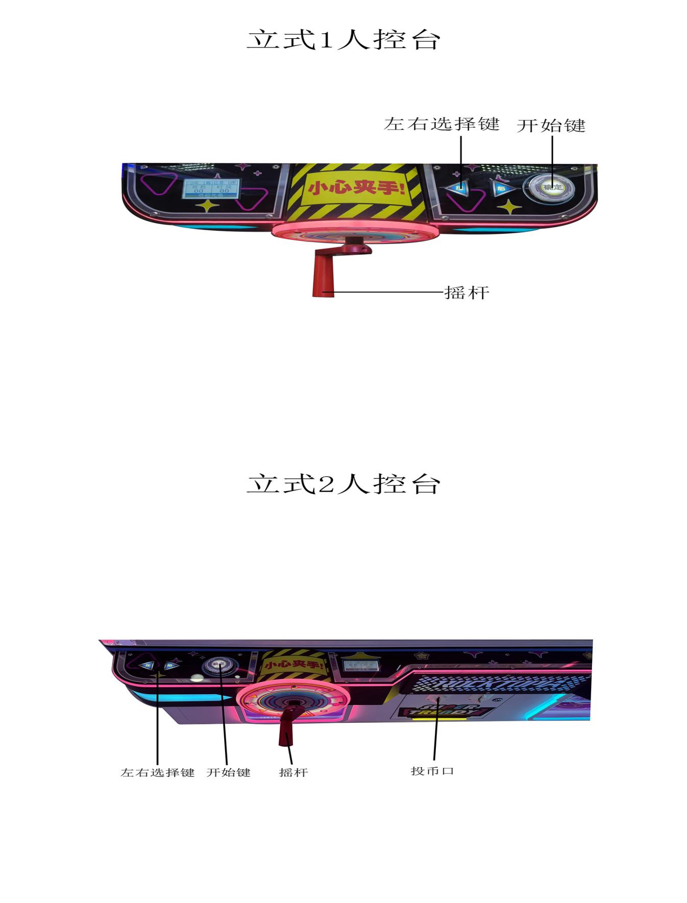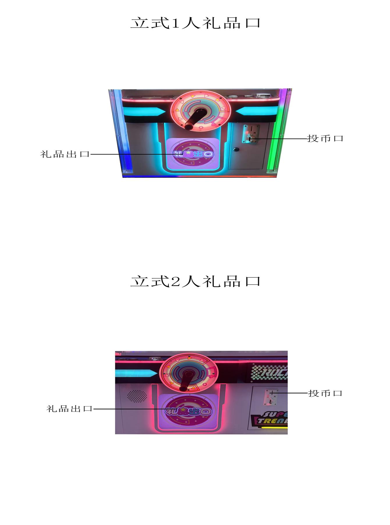 操作说明:一、设备安全说明: 1、设备总功率为W,输入电压为220V,通过设备电源转变为12V或24V等安全直流电压对设备部件供电,对玩家无任何触电安全隐患。 2、设备玩家可接触部分,材料边、角均采用圆滑生产工艺,玩家无需担心触碰损伤。 3、设备底部装有固定装置或顶脚,设备固定后无法推动,不存在滑动倾倒安全隐患。 二、游戏操作说明: 1、游戏玩法和技巧 玩家投币后按下开始键摇动摇杆获取幸运彩球。礼品分为:绿、蓝、红等级,摇中对应颜色的彩球即可解锁对应颜色等级的礼品,中奖后玩家可通过控台上的左右键选择当前等级的心仪礼品,等待礼品掉落在取物口获取,其中白球为累计奖,玩家在游玩中累计摇中5颗白球即可开启幸运转盘 2、游戏操作步骤 玩家投币获得相应分数后即可开始游戏。 3、游戏结束后,按机器上退礼品的方式,退出相应的礼品(礼品需符合国家法律及当地政策的规定)。 错币口只用于投币器识别出的不是经营场所的错币返还出来,不可用于启动游戏,错币口不具备任何退币功能。