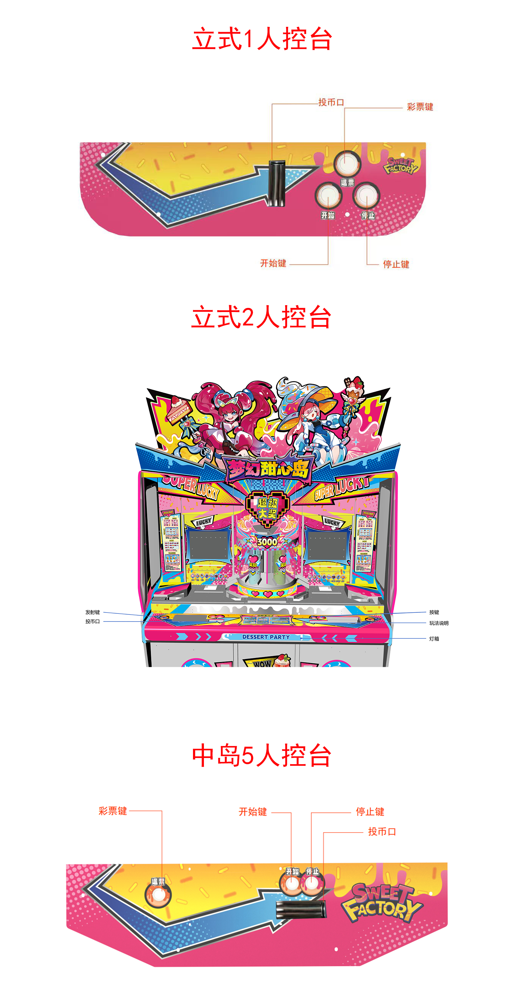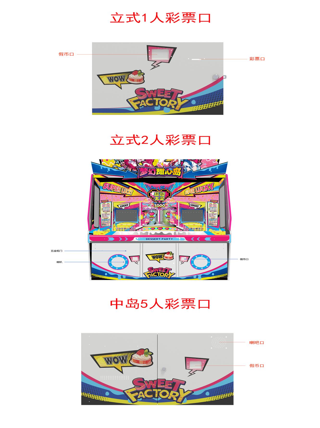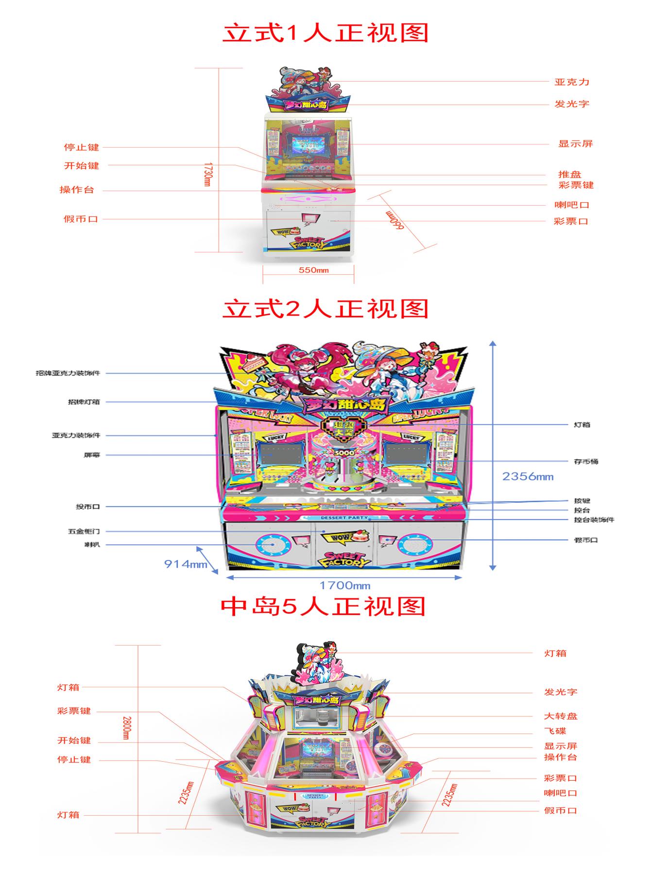 游戏内容简介:《梦幻甜心岛(立式/中岛)》是一款面向大众娱乐设计的推币类游戏游艺彩票机,本机适用于网咖、竞技馆、动漫城、商超、台球俱乐部等符合经营许可的使用场所。 一、游戏说明: 1、投入代币,按下发射键,代币会从钉板上方掉落。 2、落下的代币若通过钉板上的启动(SPIN)通道,会启动中间九宫格转盘。 3、九宫格转盘: 三个物件一样的连线方式有横线及斜线。每一种连线奖皆可获得屏幕下方所对应的物件彩票值。 4、落下的代币如通过下方亮灯的通道时,则该通道的物件分数会+1票。 5、8个通道栏框会随机出现炸弹元素,当代币落进炸弹显示的物件通道时,该物件的分数会变成10票。 二、小游戏奖项 1、叠叠乐游戏:主游戏九宫格轮转动,转出甜美人右上至左下,转出斜连线即可进入小转盘,转盘上数字分为4、5、6、7、8、10,小游戏为免费游戏,游戏给了4--10个免费代币,转盘转出几号数字就是给几枚免费代币,按开始键代币通过钉板落下,落下的代币通过钉板上“启动”代币落下的通道,会加叠一个物件,每加叠一个物件上方倍数会增加(一层=1 票、二层=3 票、三层=5票、四层=7票、五层=10票、六层=20票、7层25票、8层30票、10层40票);当可玩游戏的代币数为0时或游戏倒计时间30秒截止则结束游戏,并加总每一个通道所获得的分数为本次该游戏的奖励彩票数;同时玩家还可以选择参加锤子、剪刀和布的小游戏。 2、小玛丽游戏:玩家通过主游戏九宫格轮盘转动,若转出甜美人图案在左上至右下形成3个连线(斜线),即可进入小玛丽免费游戏模式。免费游戏轮次玩家无需额外投币,通过亮框在跑动的图形中随机停止获得对应累积彩票数。亮框移动速度逐渐加快,倒计时归零或停在“OUT”区域时结算当前分数并可以选择参加锤子、剪刀和布的小游戏。 3、甜心时刻:玩家通过主游戏九宫格轮盘转动,若转出甜心时刻图案形成3个横连线,游戏即进入转轮转动选择时间,时间分为20秒、30秒、40秒、50秒、60秒、70秒、80秒,转轮转出的秒数即可进入开心20--80秒游戏模式。玩家需要在20--80秒限定时间里投币击中飞碟,击中一次可获得50票奖励,依次叠加,击中越多奖励越丰富。 4、全盘奖游戏:主游戏九宫格转盘转动,当九宫格转成全部相同的物件时为全盘游戏,给予6桶雪糕桶+累计彩票数(累计分从上币马达出币)奖励。 5、 砸金蛋游戏:当九宫格出现左右交叉甜美人连线时,游戏将进入砸金蛋游戏,金蛋分为1桶、2桶、3桶、4桶、5桶和6桶游戏币,光标按顺序移动,玩家需要按下开始键光标停止,光标停下后立即砸开金蛋后将获得相应的桶数奖励。中心转盘将倒下获得的桶数代币,倒完代币后游戏结束。代币落入推盘上面,推盘不停来回推动,掉落的币退出相应的彩票。游戏结束后,玩家可用获得的电子分数彩票票数手动选择退实物彩票/电子彩票,到店面吧台用实物彩票/电子彩票兑换精美礼品。玩家也可以选择退电子彩票直接返还到玩家手机上,也可以用手机扫卡头/屏幕二维码领取电子彩票,都可以链接到电子商城上选择心仪的礼品使用电子彩票兑换,填写正确的收货地址,商城将礼品通过快递送达。同时为了“顺应“互联网+”发展趋势,鼓励娱乐场所与互联网结合发展,实现场内场外、线上线下互动,增强娱乐场所体验式服务”的要求,本设备可以通过物联网技术把实体游戏游艺设备的游戏内容推送到移动端供客人游玩,仅限于从实体设备所在的公众号、小程序、APP及网络推广平台入口进入的玩家游玩。