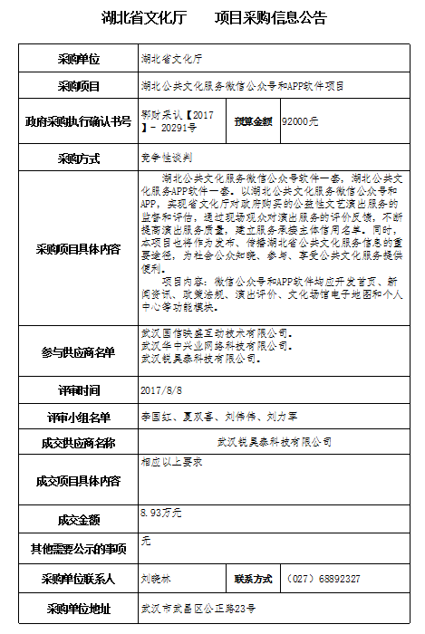 湖北公共文化服务微信公众号和APP软件项目采购结果公示