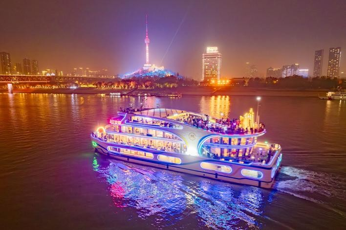 2月4日晚,武汉夜游标杆游船“长江荣耀”轮焕新回归长江夜景画卷。 (柯皓 摄)