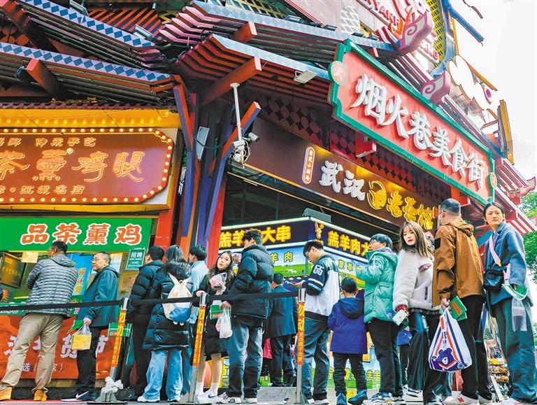 ◀2024年11月30日,游客在江汉路步行街排队选购特色美食。