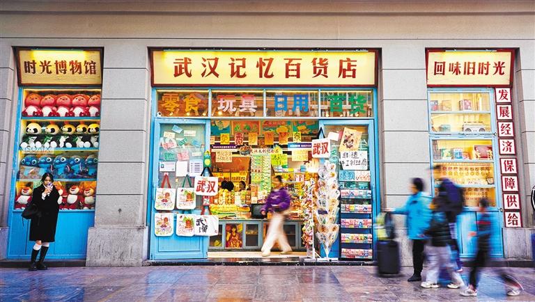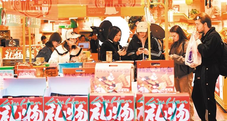 ▲2024年11月29日,江汉路步行街上带有武汉礼物标识的伴手礼及特色美食受到中外游客青睐。
