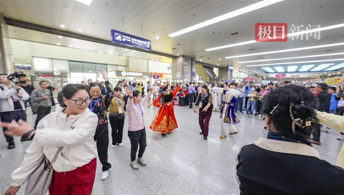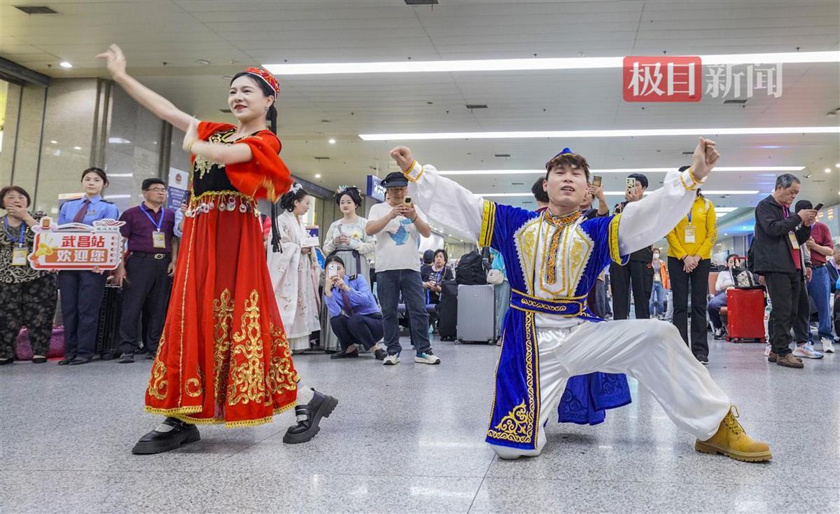 9日上午9时许,极目新闻记者来到武昌火车站候车厅一层,专属候车区内已座无虚席。两名特邀的新疆籍演员身着民族服饰,正在为大家表演新疆舞。舞蹈间隙,不少叔叔阿姨还拉着他们合影拍照。两人虽然累得满头大汗,却依然摆好pose一一满足大家的要求。“叔叔阿姨们真热情,欢迎他们到我们的家乡去做客。”