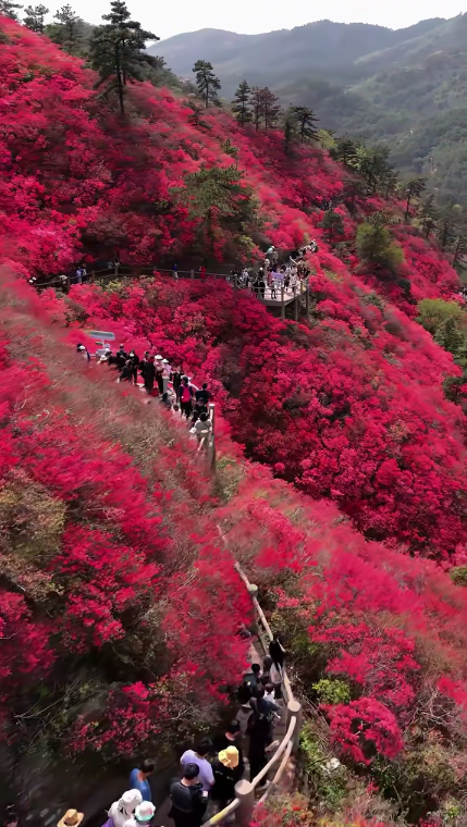 拥有10万亩原生态古杜鹃花的龟峰山被誉为“大别山上最美红飘带”,也是世界上最大的古杜鹃群落。