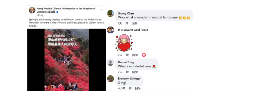 “花开如云雾,美不胜收。”4月10日,中国驻柬埔寨大使汪文斌在Facebook上发布武汉云雾山杜鹃花盛开视频,引发海外网友热烈讨论,不少用户发出“Wow what a wonderful natural landscape(令人惊艳的美景)”“What a wonderful view(太令人震撼的景观)”等赞叹。