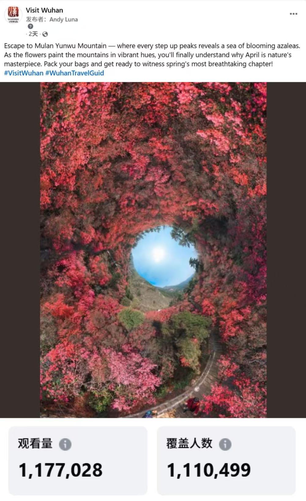 同日,武汉文旅海媒账号“Visit Wuhan”同步发布以云雾山杜鹃花为主题“spring's most breathtaking chapter(最美人间四月天)”帖文,话题在48小时内突破百万浏览量,让“云中花”在海外“出圈”。