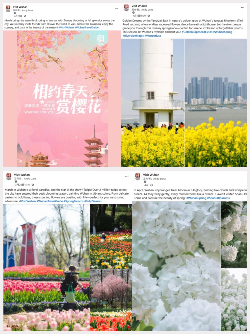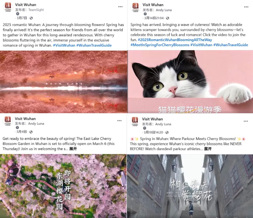 为向全球网友推介武汉文旅资源,Visit Wuhan充分发挥图文与短视频的传播优势,通过海外社交媒体平台陆续发布多个赏花主题帖文,形成“云赏花”体验。内容涵盖东湖樱花、解放公园郁金香、月湖公园绣球花,江滩油菜花等热门赏花地。这些极具视觉冲击力的画面和生动解说,吸引大量海外网友驻足点赞、转发、评论。截至目前,该系列内容累计曝光量突破两百万次,提升了武汉在国际社交平台的知名度与美誉度。