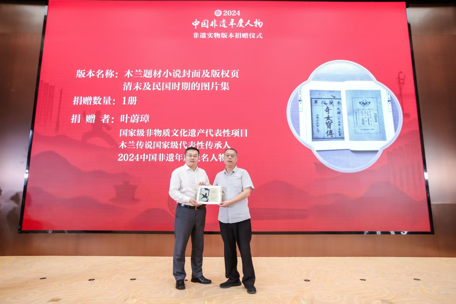 长江日报大武汉客户端6月27日讯(记者冯爱华)6月26日,2024“中国非遗年度人物”在京揭晓,木兰传说国家级代表性传承人、武汉民间文艺家协会副主席叶蔚璋荣膺提名人物称号,并向中国国家版本馆捐赠实物版本:木兰题材小说封面及版权页、清末及民国时期的图片集。