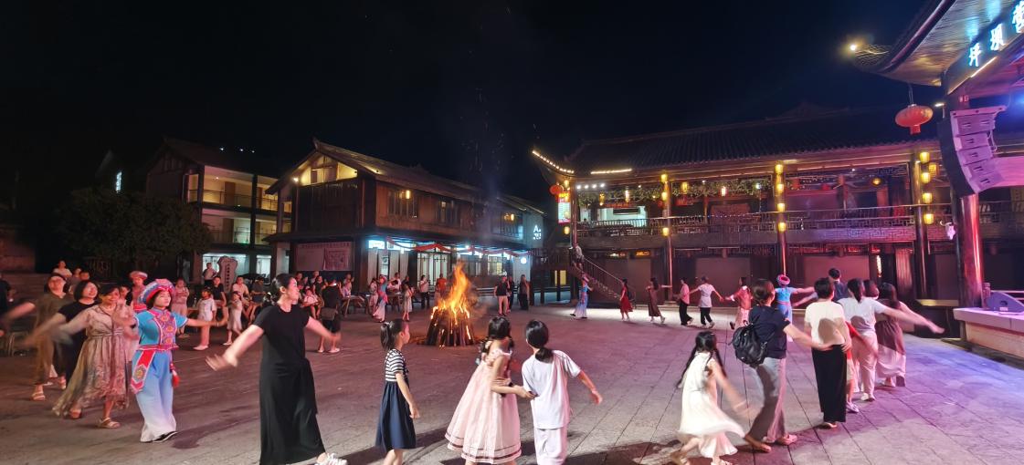 (图片:篝火晚会上,城乡家庭一同跳起摆手舞)