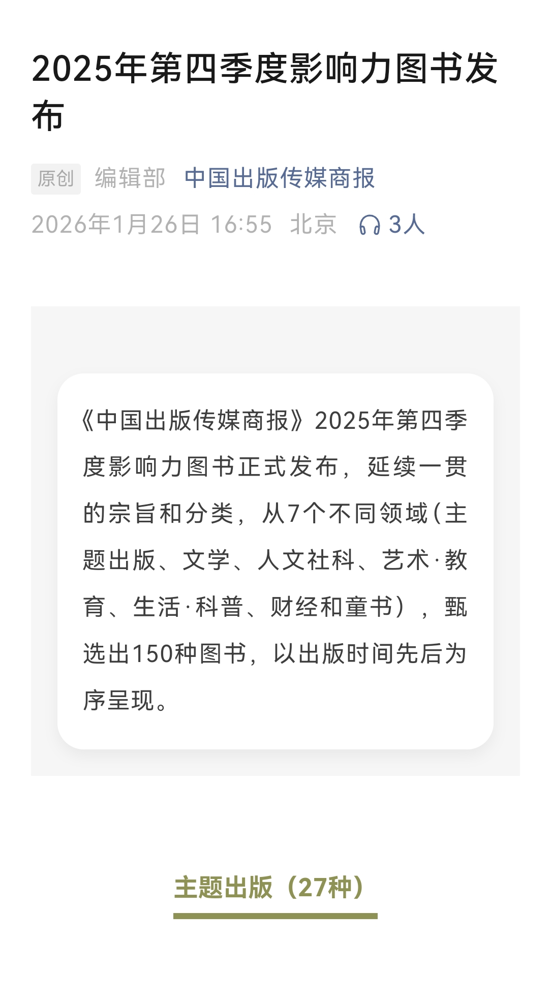 《中国出版传媒商报》季度影响力图书榜单是国内出版界公认的权威推荐书单。该榜单自2012年开始连续推出,其流程严谨,评价体系综合性强,兼具专业度与公信力。