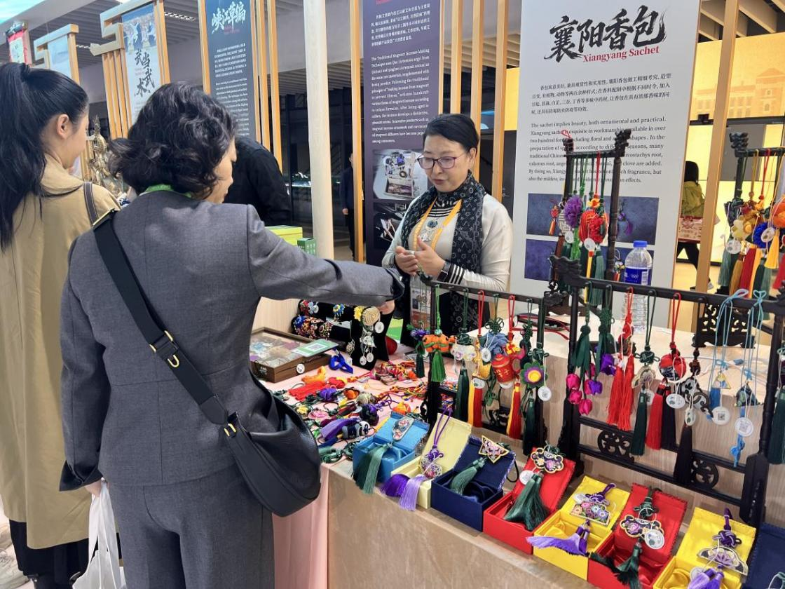 展厅汇聚了武当武术、黄梅戏、云梦皮影戏、红安绣活、武汉剪纸、黄州蓝靛印染、襄阳香包、武汉螺钿镶嵌、峡江草编、传统艾香制作技艺、叶开泰传统中医药文化等十余项非遗产代表性项目,以“展演+互动+展示”的多元形式,搭建起中外人文经贸交流的重要桥梁。