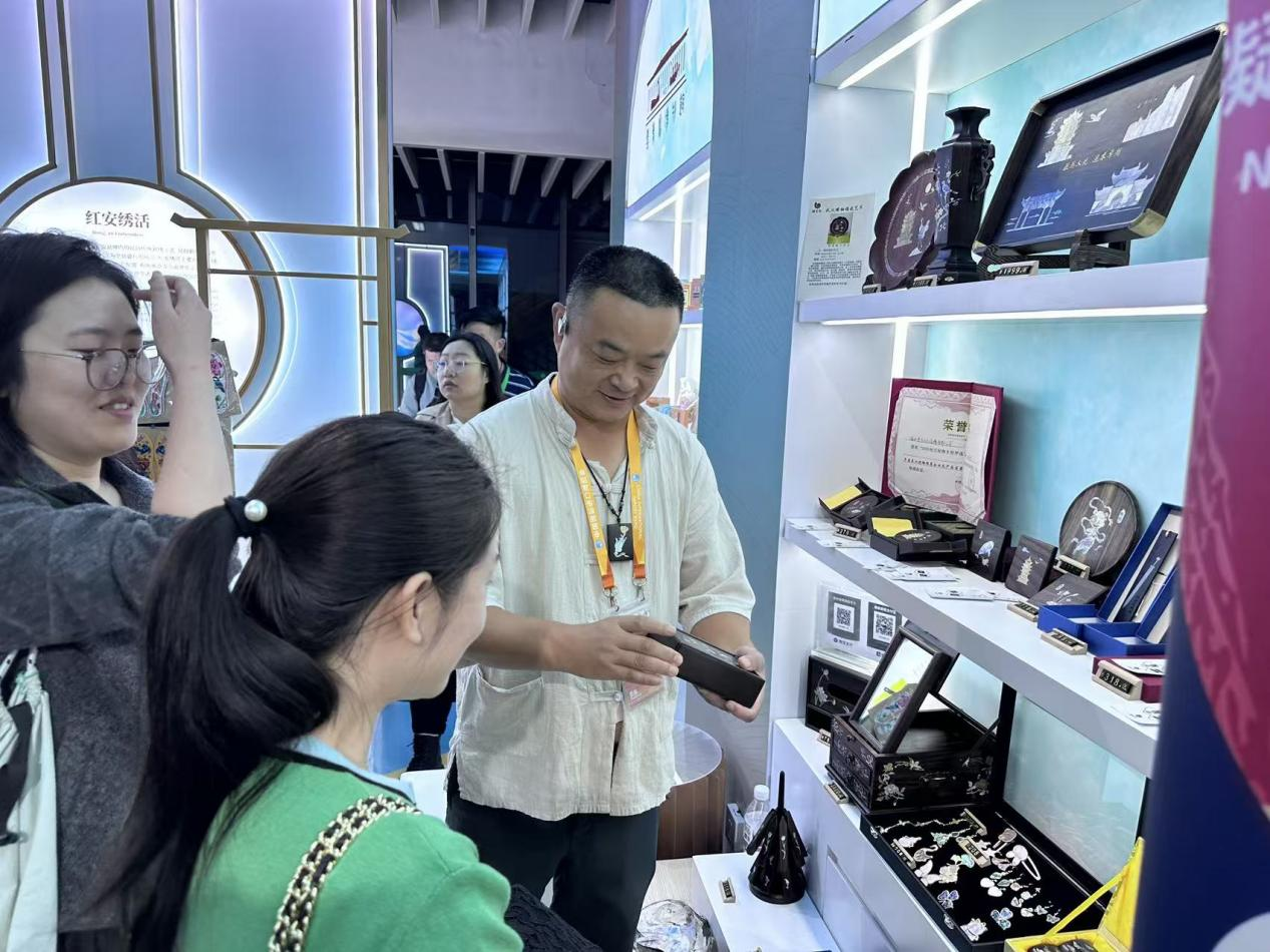 武汉剪纸传承人仅用一张红纸和一把剪刀,指尖翻飞间一幅幅栩栩如生的十二生肖作品脱颖而出,带来的立体剪纸作品一度让现场观众以为是昆虫标本;襄阳香包传承人向游客讲解香料配伍和刺绣技艺,各式各样的香包图案配上中草药,既好看又有保健的作用;武穴传统艾香制作技艺传承人向游客推广艾香文化知识,带来展示的艾香产品创新传统制香配方,把“以艾制香,用香防病”的健康理念融入其中;红安绣活传承人手把手现场教学,游客手中的绣布不一会儿就蜕变为一幅简约而不简单的刺绣作品,成就感瞬间拉满;黄州蓝靛印染产品以木蓝和蓼蓝为原料,通过自然发酵染色,布料柔软温润,植物印染呈现独特的自然色彩,深受爱美女士的青睐;峡江草编传承人的手仿佛有化腐朽为神奇的魔力,小到昆虫大到花瓶等各种不同的作品引得往来游客啧啧称奇;螺钿镶嵌技艺作品造型简约大气,螺钿纹样沿袭传统工笔画技法,线条细腻精致,流光溢彩,精美与朴实共存,具有极高的审美和收藏价值。