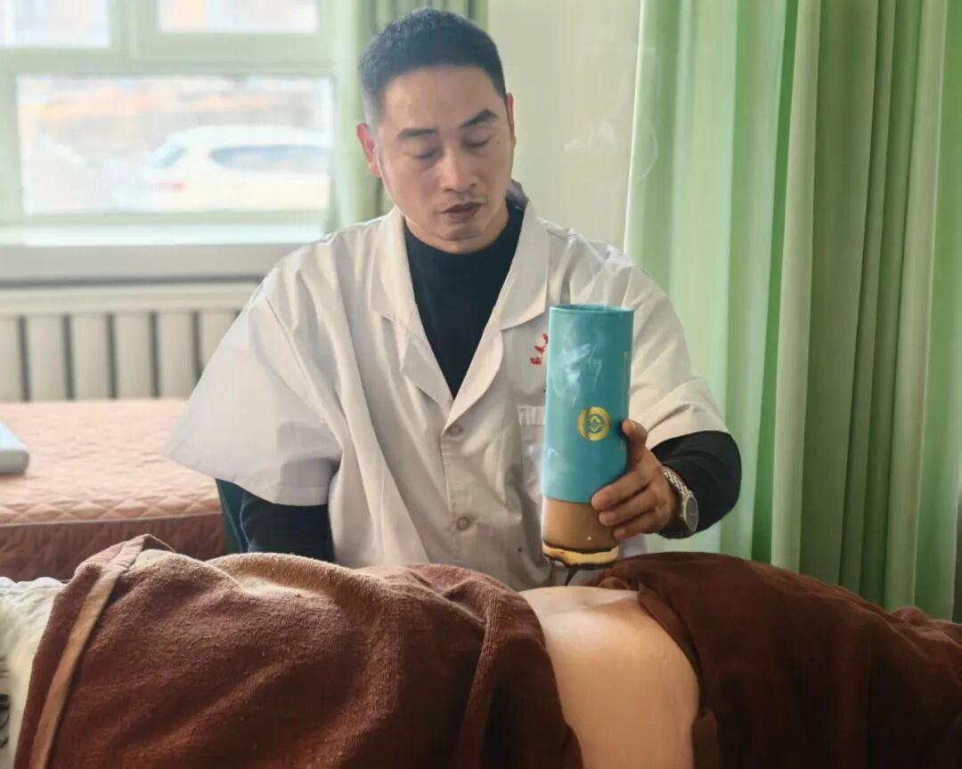 潜江中药炮制技艺传承人向传模为患者进行中药膏棒疗法