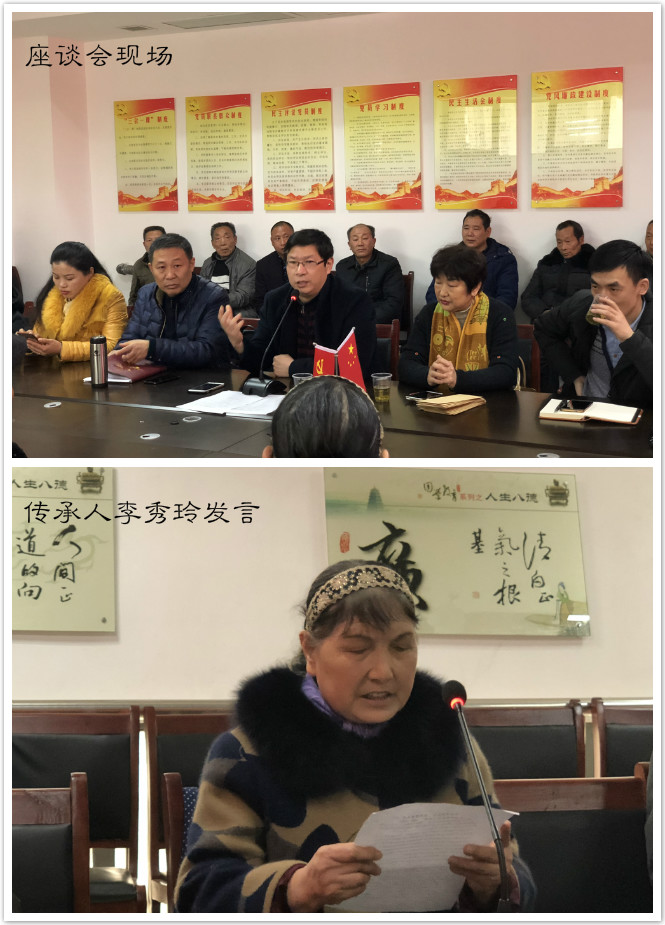 座谈会上,南漳县文化馆馆长王德振、副馆长信国洋先后就2017年非遗保护工作进行了汇报,以一组组详实的数据介绍了南漳县一年来非遗保护所取得的丰硕成果,同时也对传承人提出了殷切的希望。随后,南漳剪纸传承人李秀玲、呜音喇叭传承人刘国福、高跷花鼓传承人刘兆军、武镇闹年锣鼓传承人李书法等分别对一年来的工作进行总结和回顾。同时也表示将积极履行传承职责,主动招收学徒传授技艺,全力以赴做好非遗项目的保护、传承与弘扬。