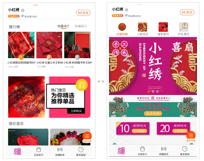 △ 大冶刺绣项目对网店的产品类目、展示等进行优化(左图为过去,右图为现在)