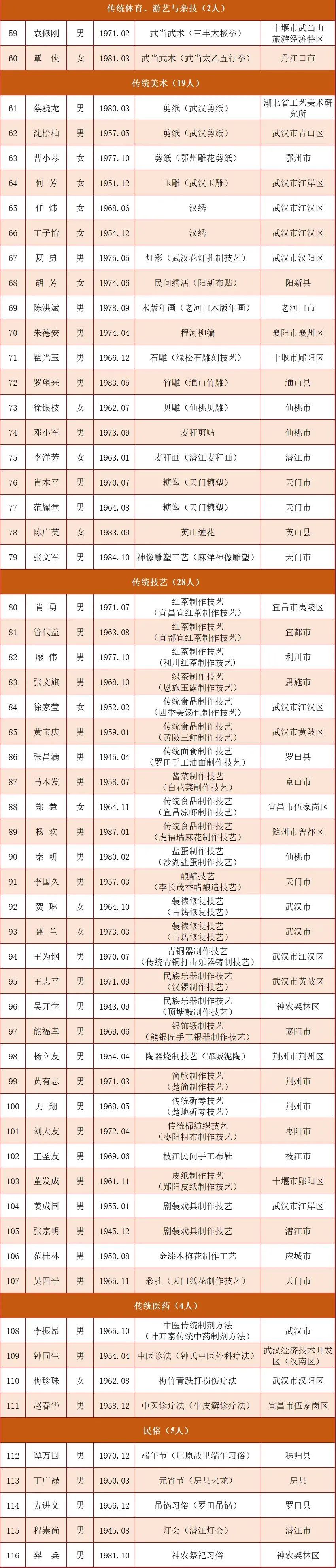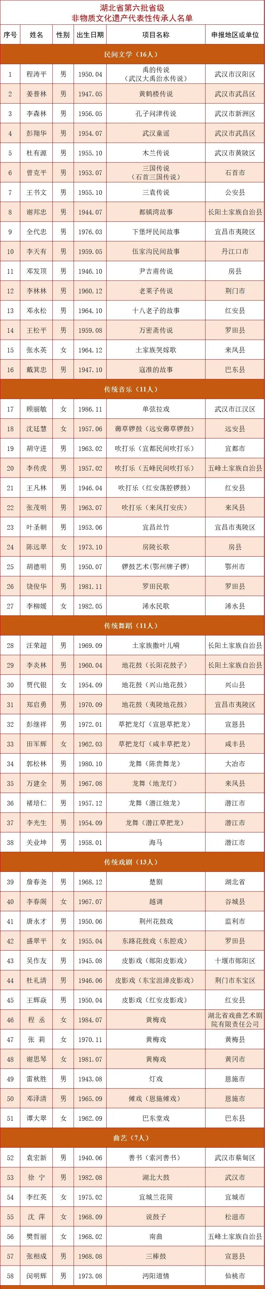 为切实做好我省非物质文化遗产保护传承工作,推动荆楚优秀传统文化创造性转化和创新性发展,进一步提高湖北省非物质文化遗产系统性保护水平,5月26日湖北省文化和旅游厅公布了第六批省级非物质文化遗产代表性传承人名单,共116人,涵盖民间文学、传统音乐、传统舞蹈、传统戏剧、曲艺、传统美术、传统技艺、传统医药、民俗,以及传统体育、游艺与杂技等领域。