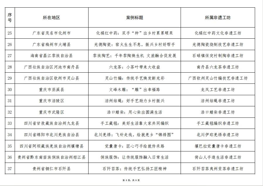 根据《文化和旅游部办公厅 人力资源社会保障部办公厅 农业农村部办公厅关于推荐第二批“非遗工坊典型案例”的通知》安排,文化和旅游部、人力资源社会保障部、农业农村部组织开展了第二批“非遗工坊典型案例”(以下简称“典型案例”)推荐工作,在各地积极申报的基础上,经研究遴选并经公示,确定了51个典型案例,现将名单予以公布(见附件)。