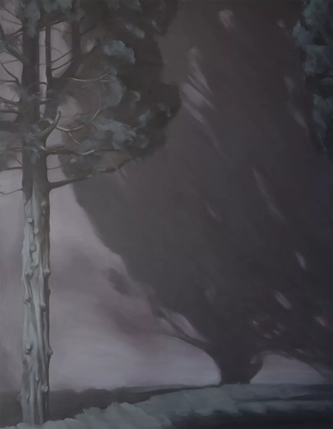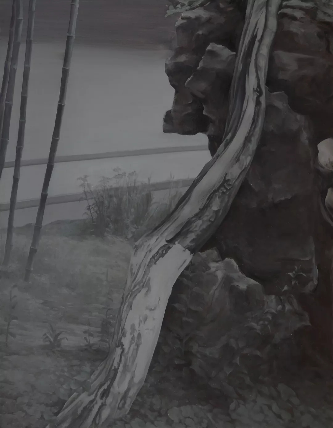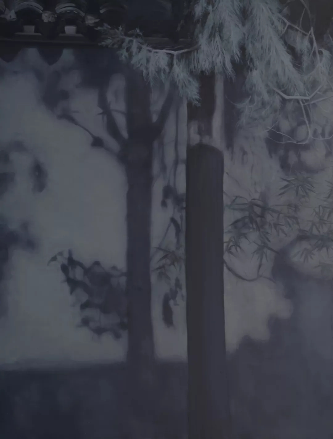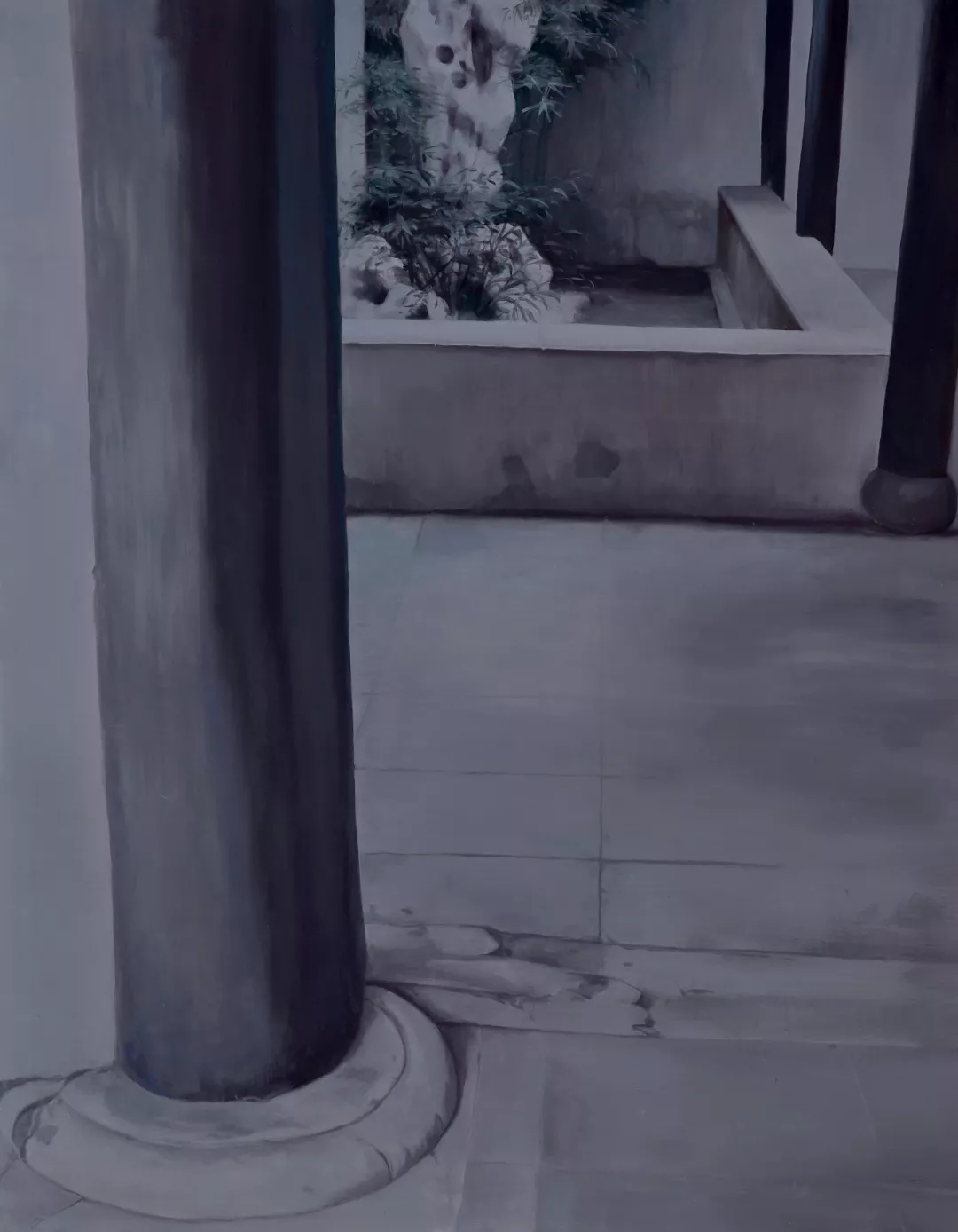 新作中,肖丰保持着自我制约式的审慎和节制,他剔除了明确的色彩表达,用小范围的灰色涵盖所有的形态和关系。《后院》中,西方经典的构图被用来重构中式庭院的一隅。一根廊柱占据了画面左侧相当的位置,廊顶的消失使剩余空间相对不受挂碍。观赏者的视线被挤压到右侧逼仄的空间后不得不向内部延伸,落在角落里的天井上。绝大多处的笔触被抹平,唯独天井里细竹、兰草的勾画保持细致。放大的角落蕴藏着某种细腻且精妙的完整性,它透露出一个信息,即:天井中清冷的月光连接着对现实色彩的记忆,它令观赏者在辨认时确信草叶上存在一缕幽深的绿色,可只要视线有瞬间的跳出,绿色便立刻汇入灰色的迷雾、无迹可寻。《盆栽松》中,人工造型的盆栽、廊柱的石基座、匆匆经过的游客,毫无关联的三者因为即时拍摄被凝固在非经典、日常态的一瞬间。肖丰用反传统的构图向观赏者暗传了生活中某些熟悉的形式:它可以是不在眼下的现实,可以是非抽象的观念,更可以是昔时感伤、江南无所有的点点感怀,但唯独不对应“江南”本身。